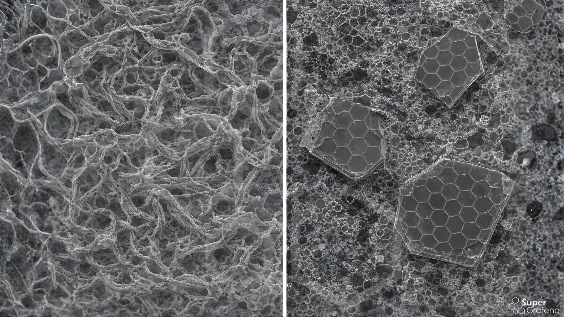 Comparação ilustrativa da microestrutura de um polímero puro (à esquerda) e de um compósito polimérico reforçado com grafeno (à direita). No material convencional, observa-se uma estrutura amorfa com cadeias poliméricas entrelaçadas e distribuição irregular de poros. Já no compósito, nanoplaquetas de grafeno com estrutura hexagonal característica encontram-se dispersas na matriz, contribuindo para a formação de uma rede de reforço capaz de melhorar propriedades mecânicas, térmicas e funcionais.